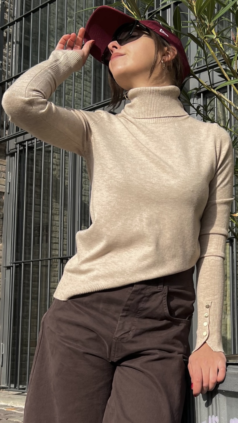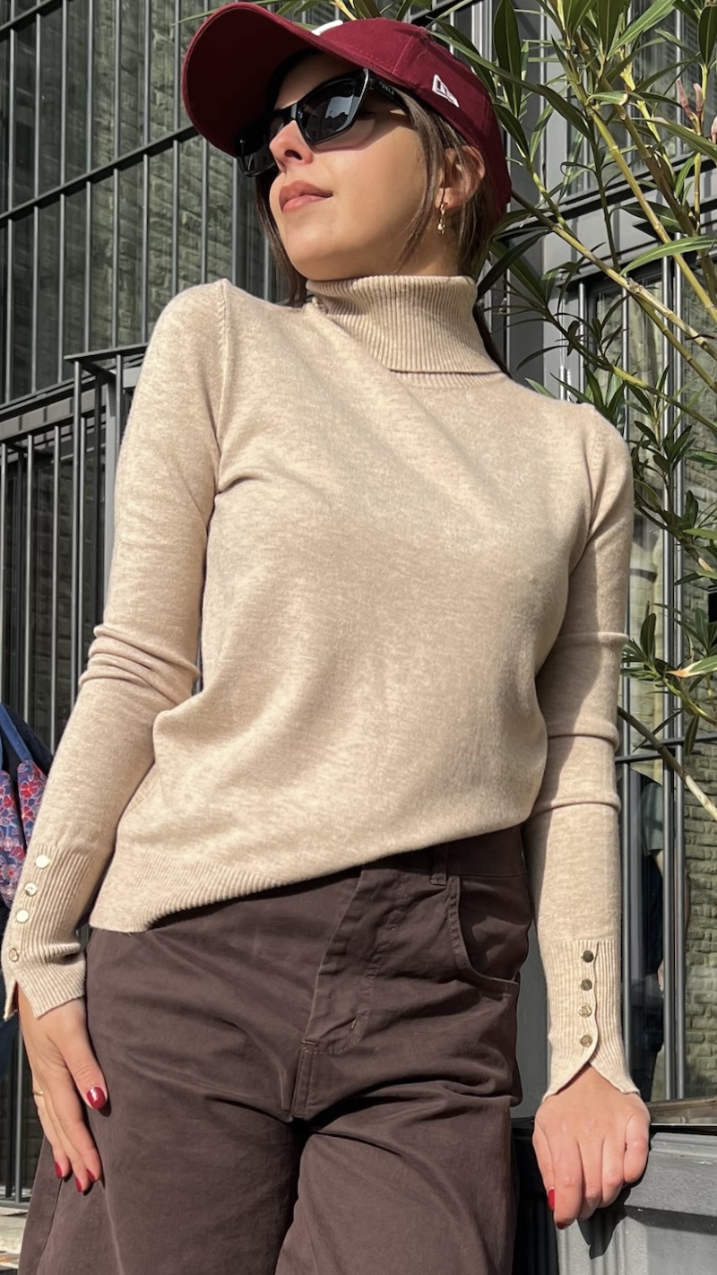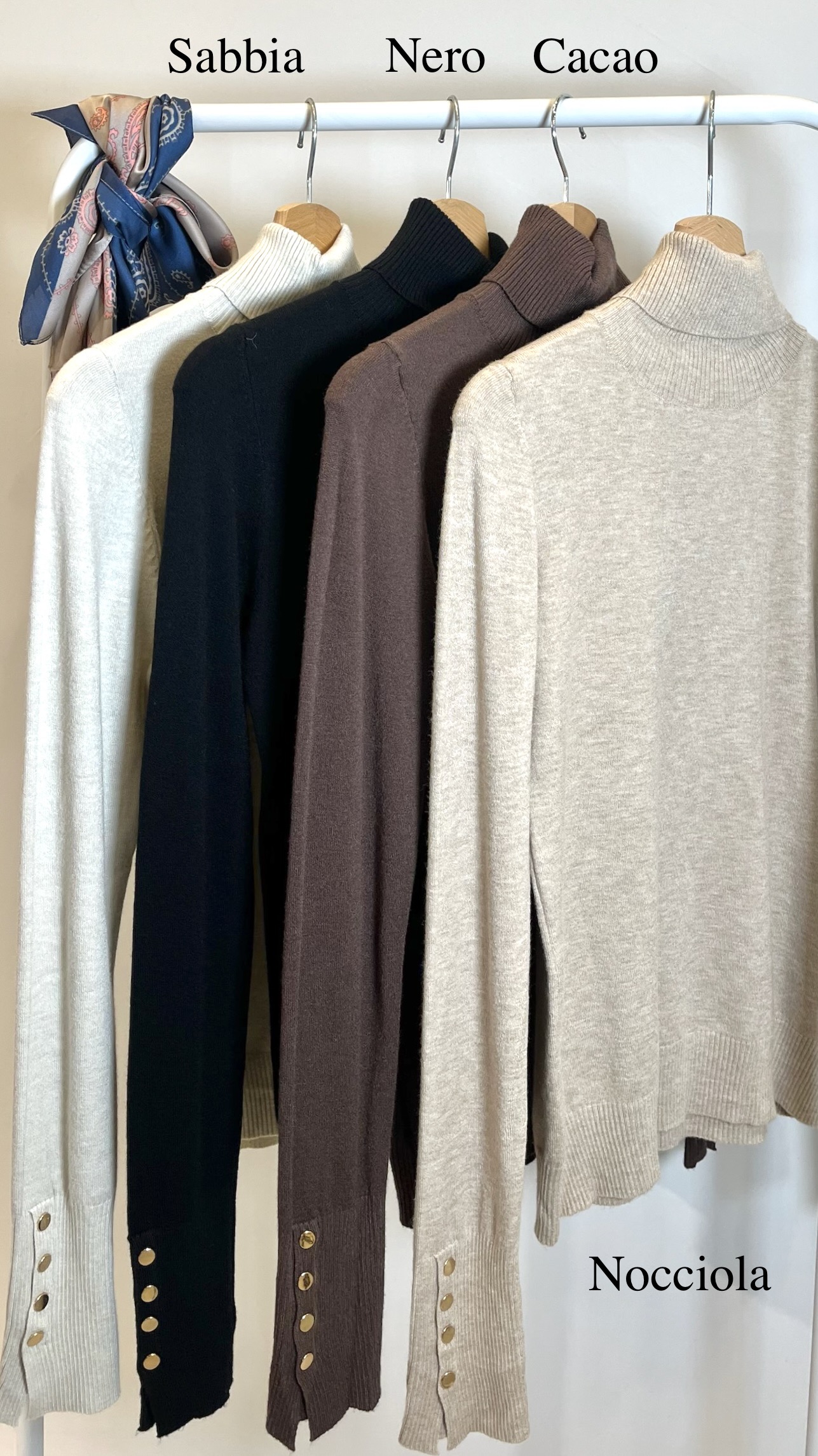 modello a dolcevita con dettaglio a bottoncini oro sulla manica.